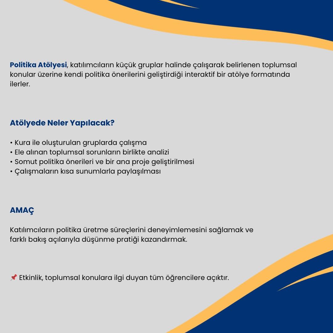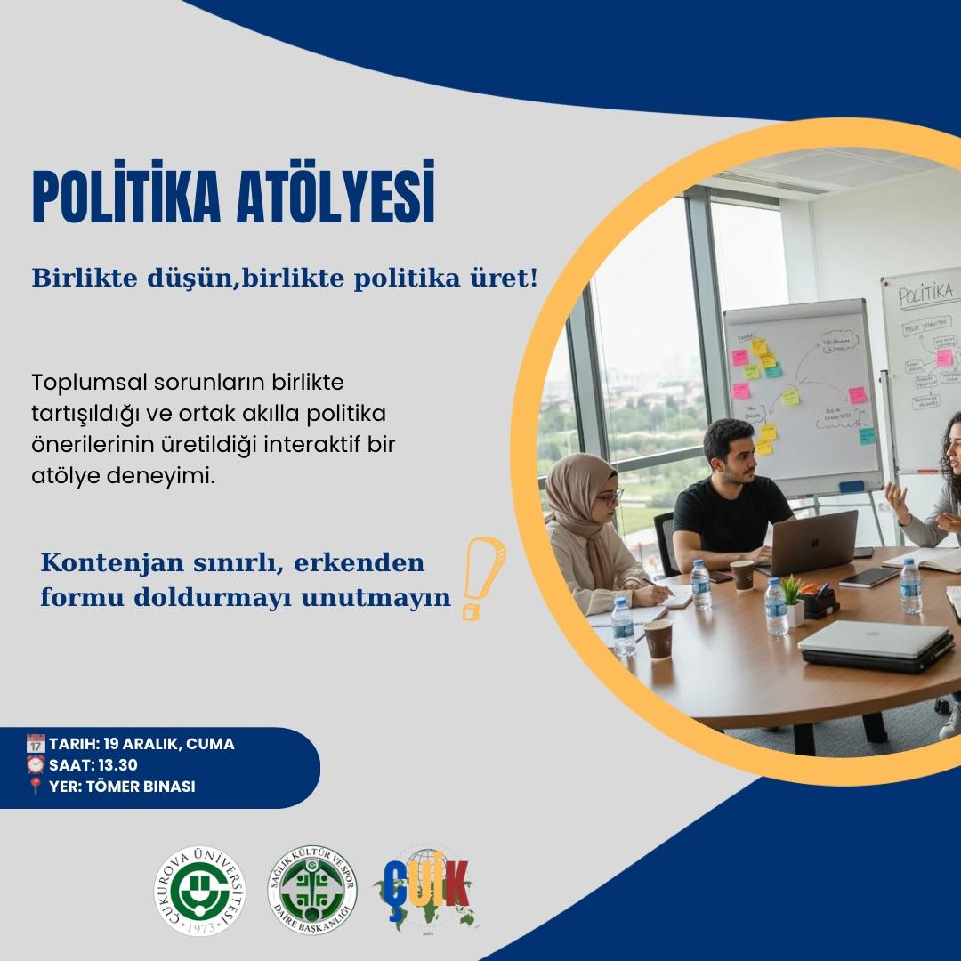 Uluslararası İlişkiler Kulübü (ÇÜUİK) tarafından, 19 Aralık 2025 tarihinde Siyaset Bilimi ve Uluslararası İlişkiler Bölümü öğrencilerinin ve öğretim üyelerinin katılımıyla bir "Politika Atölyesi" düzenlenmiştir. Etkinliğe bölümümüzden Prof. Dr. Harun ARIKAN, Dr. Öğr. Üyesi Burcu Sarı KARADEMİR ve kulüp danışmanı Dr. Kasım TİMUR katılım göstermiştir. Ayrıca, Teknososyal Sürdürülebilirlik ve Dijital Dönüşüm Derneği Başkanı Sayın Viyan Aras Levent de değerlendirme jürisinde yer almıştır.